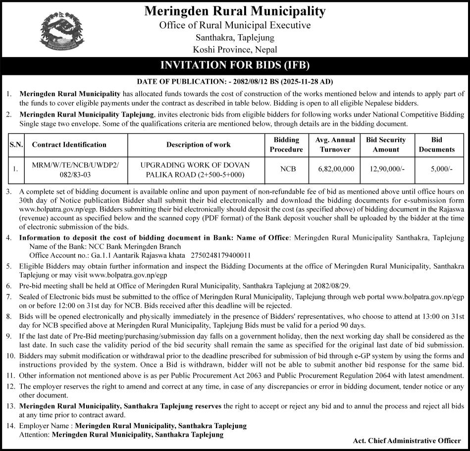Invitation For Bids (IFB) - Upgrading Work of Dovan Palika Road
